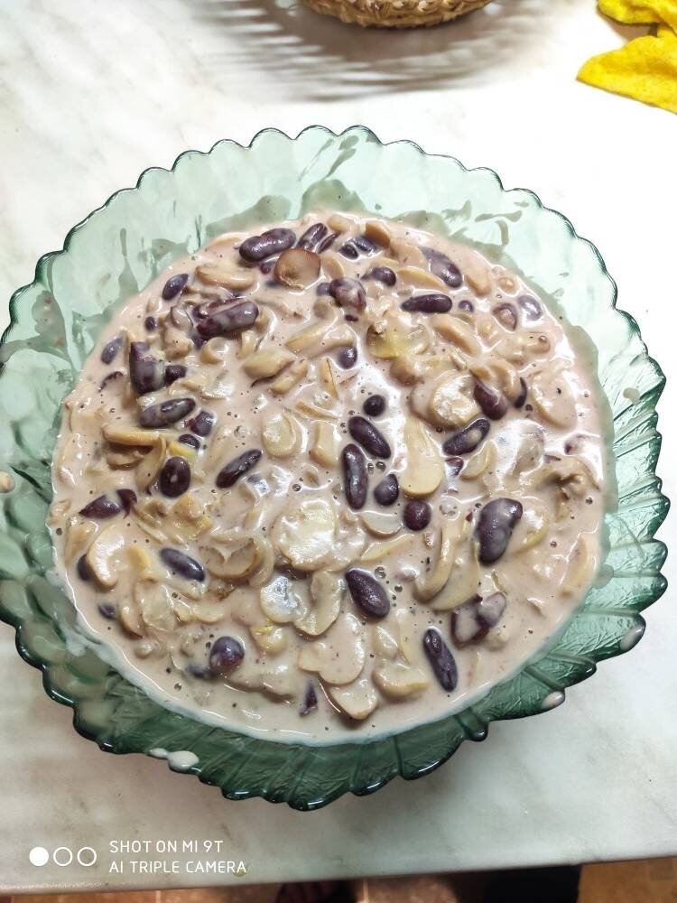 Очень вкусный и приятный на вкус салат на основе шампиньонов и фасоли, особенно только что приготовленный, но и холодный не менее вкусен, очень легко готовится, обязательно попробуй Ингредиенты: красной фасоли в собственном соку, шампиньонов нарезанных или эквивалент свежих, средняя луковица, Сметана любой жирности, Майонез, По желанию чеснок и чайная ложка муки, Соль, перец, масло растительное Способ приготовления: Нужна глубокая сковорода, нарезаем лук полукольцами и обжариваем на масле до золотистого цвета. К луку добавляем консервированные грибы или свежие нарезанные, обжариваем минут 10. Добавляем к грибам и луку фасоль вместе с соком из банки перемешиваем, держим на среднем огне ещё минут 5. Пока грибы с фасолью разогреваются на огне делаем соус, все просто 50/50 смешиваем сметану и майонез по желанию можно добавить чеснок мелко нарезанный или выдавленный. Как только грибы с фасолью начали закипать солим/Персии по вкусу и добавляем только что сделанный соус, перемешиваем, грибы и