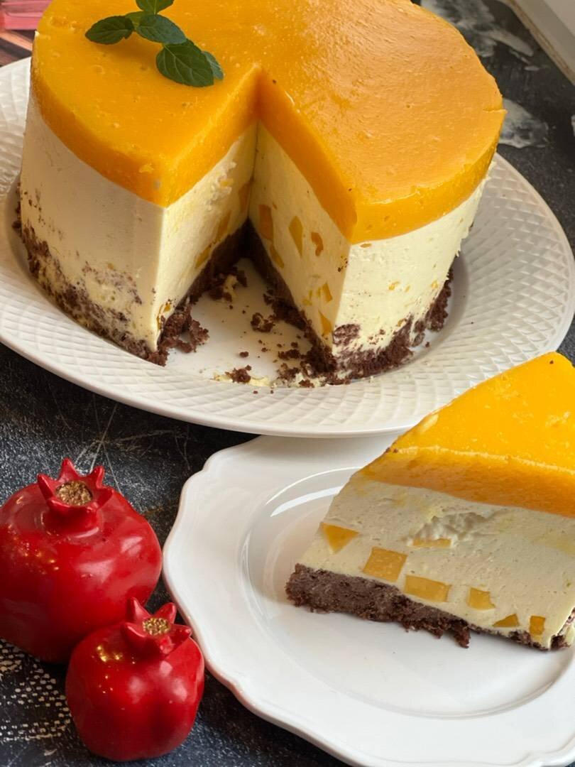 Ингредиенты: сливки 33% , маскарпоне, молока, желатина, мякоти манго, сахара, Манговый мусс, манго, сахара, желатина, воды, печенье (у меня шоколадное) Способ приготовления: Желатин замочить. Одну часть в молоке, другую в воде. Дать набухнуть и потом прогреть импульсно в микроволновке до растворения. Взбить сливки с сахаром, маскарпоне. Добавить желатин с молоком. Ввести нарезанное манго. Перемешать. Печенье измельчить в блендере, добавив пару ложек заготовки для торта. Тщательно перемешать. В разъёмную форму на дно выкладываем крошку из печенья. Утрамбовываем дном стакана и убираем в холодильник на 15 минут. Достаём форму и выливаем оставшиеся крем. Слегка бьем рукой о стенки формы, чтоб вышел лишний воздух. Убираем в холодильник на полчаса. Желатин замачиваем в воде. Даём набухнуть и прогреваем слегка, чтоб желатин хорошо разошёлся. В блендере соединяем и хорошо пробиваем манго, сахар и желатин. Достаём форму и выливаем наш манговый мусс. Вращая аккуратно форму, равномерно распределя