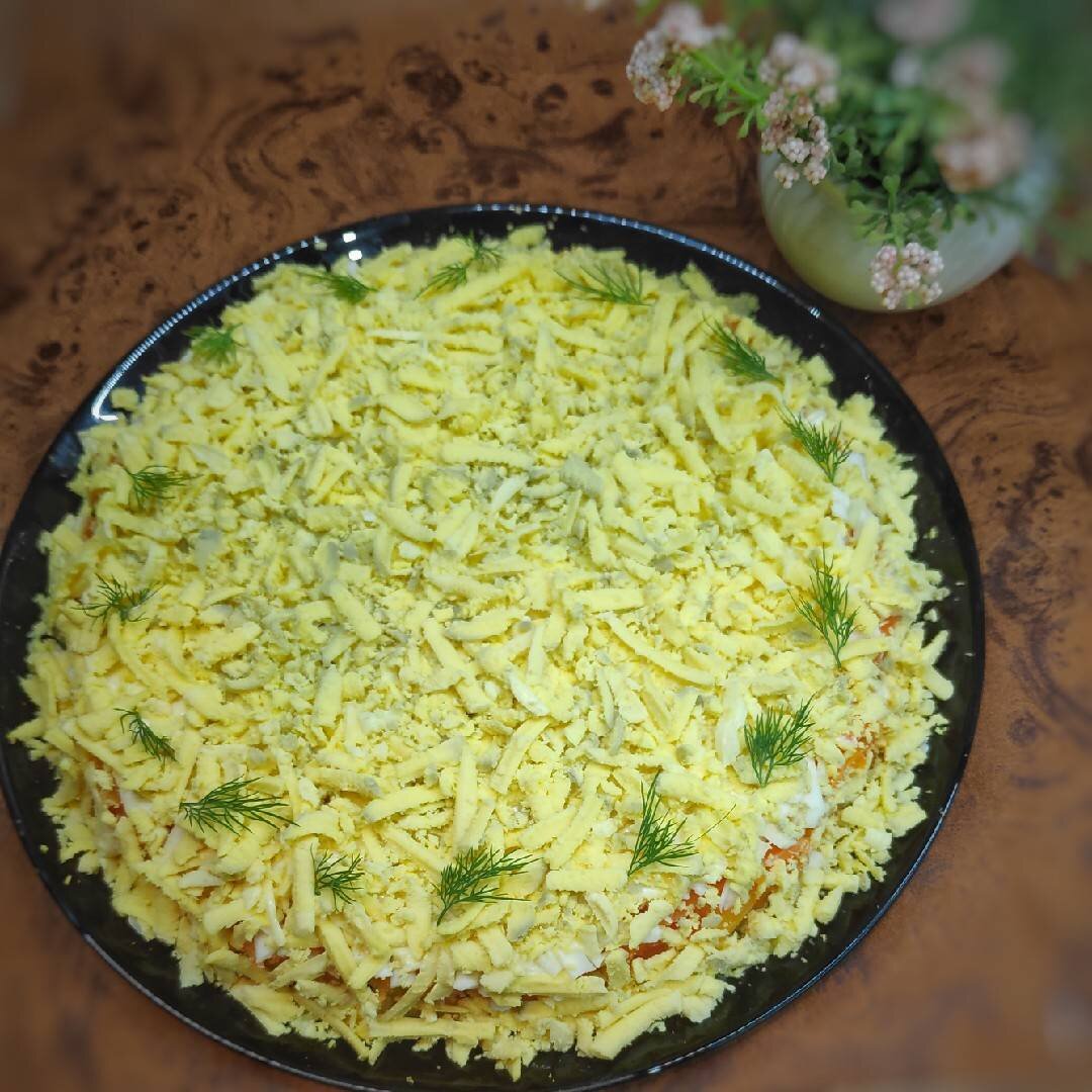 С днём рождения меня и Cookpad🥳! #кукпад4 Ингредиенты: консервированной сёмги, морковь, луковица, плавленый сырок, яичных желтков, Майонез Способ приготовления: Лук мелко нарезать и на 20 минут залить кипятком. В это время в подсоленной воде сварить яйца, картофель, морковь. Морковь, картофель, сырок, желтки будем тереть на тёрке. Рыбу (без жидкости) размять вилкой. Выкладывать слоями на плоскую тарелку: картофель, майонез, лук, рыба, морковь, сырок, майонез, желтки. Поставить в холодильник пропитаться. Приятного аппетита😍! Если вам по душе мои незатейливые рецепты: подписывайтесь и оставляйте свои фотоотзывы📸!
