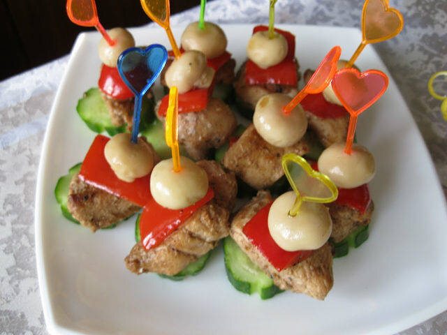 Самое первое фото этой закуски. лет 15 Ингредиенты: куриная грудка , болгарский перец, свежий огурец, грибочков из магазина Способ приготовления: Грудку режем на кусочки и маринуем в соевом соусе, я на ночь оставляю. Огурец режем на кружочки. Перец режем на мелкие части и немного даем ему тепловую обработку на сковороде, но можно и упустить это. Грибочки тоже проходят тепловую обработку. Собираем на шпажку.