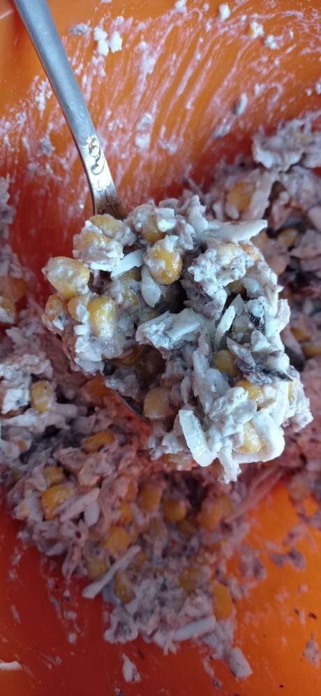 Муж захотел салат, хоть какой-нибудь... И вот из того что было в холодильнике, появился на свет этот шедевр 😆 Ингредиенты: Шпроты, Кукуруза консервированная, Лук репчатый, Яйца, Майонез Способ приготовления: Шпроты размять вилкой, яйца отварить вкрутую и натереть на крупной терке, лук нарезать полукольцами. Смешать все ингредиенты и заправить майонезом. Я шпроты добавляла вместе с маслом, получилось жирновато и мы кушали как намазку на хлеб, в этом сочетании вышло очень вкусно. Приятного аппетита😋