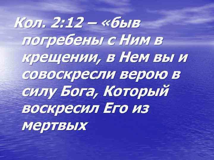 «Быв погребены с Ним в крещении, в Нём вы и совоскресли верой в силу Бога, Который воскресил Его из мёртвых, и вас, которые были мертвы во грехах и в необрезании плоти вашей, оживил вместе с Ним, простив нам все грехи» (Кол. 2:12, 13).