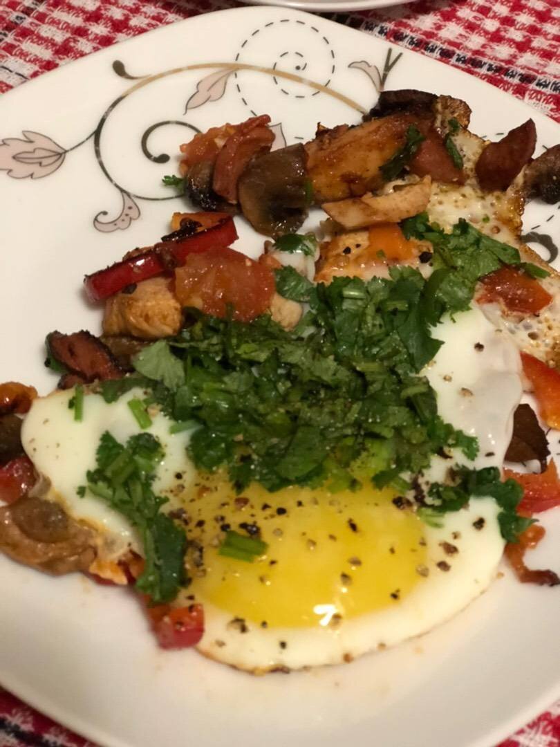 #кукпад4 . С днём рождения 🎉🎉🎉 Cookpad ❤️❤️Благодарю всех Вас за вашу работу на сайте, так же вдохновили меня на приготовление домашней еды😋👩🏽🍳. Яичница является одним из самых популярных завтраков😋. Чтобы яичница получилась более пикантной, всегда добавляю свежую подрезанную зелень👩🏽🍳❤️. Ингредиенты: Куриное филе отварное, Яйцо, Масло для жарки, Соль, перец, специи, Помидор, Сосиска, Грибы шампиньоны, Перец болгарский Способ приготовления: Филе порезать и на раскалённой сковороде обжарить на сливочном масле. Добавить грибы, сосиску, помидоры обжарить Перец порезать полукольцами, добавить яйцо, посолить, поперчить, специями присыпать, довести до готовности и сверху посыпать кинзой 👩🏽🍳. Яичница готова 🤍. Подавать к столу 😋. Приятного аппетита ❤️.
