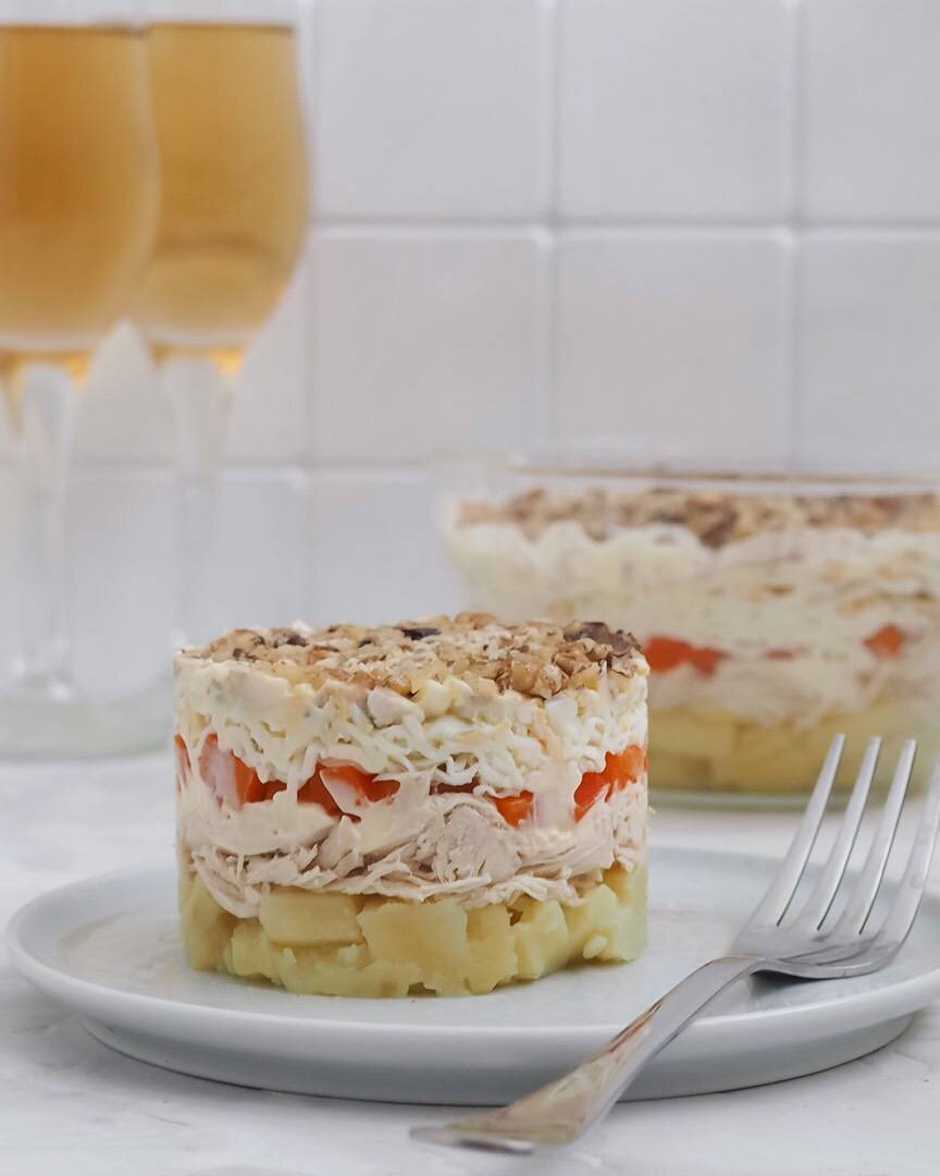 Количество ингредиентов берите исходя из числа гостей! Ингредиенты: Картофель, Куриное филе, Яйцо, Сыр, Морковь, Майонез, Грецкие орехи, Соль Способ приготовления: Картофель, морковь, курицу и яйца варим до готовности. Овощи нарезаем кубиком, курицу делим на мелкие волокна, яйца тоже нарезаем мелко. Сыр натираем на терке, орехи измельчаем. Выкладываем слоями: картофель, курица, майонез, немного соли, затем морковь, сыр, яйца, майонез, соль. ⠀ Сверху посыпаем салат грецким орехом, готово! Больше рецептов в моем Инстаграм ms.mague ❤️