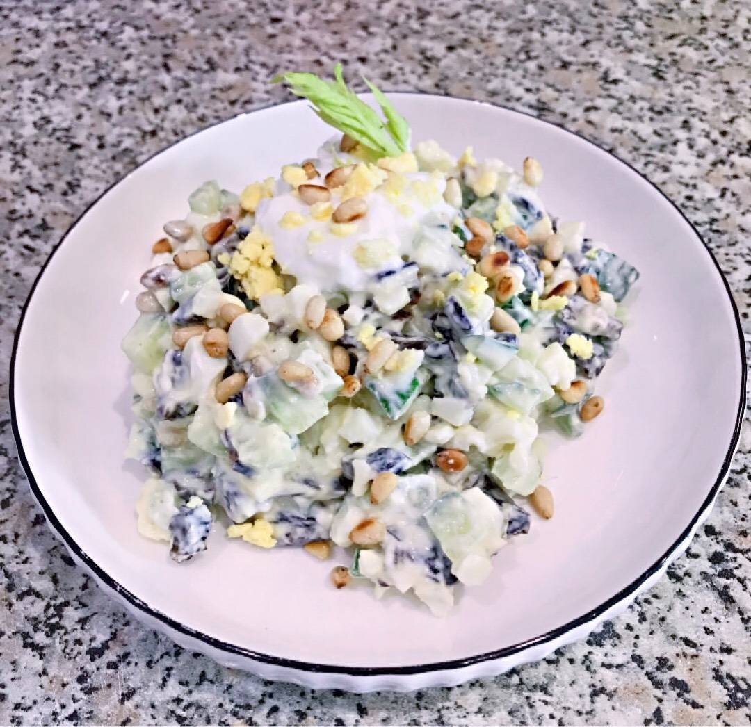 Ингредиенты: струч сельдерей, огурец средний, яйцо, гр орехи кедровые (грецкий), гр чернослив без косточек, ст л греческий йогурт (сметана), соль по вкусу Способ приготовления: Огурец и сельдерей вымыть.Сельдерей очистить.Яйца отварить в крутую. Чернослив замочить в кипятке на 5 минут.Хорошо промыть и обсушить бумажным полотенцем. Все ингредиенты порезать мелкими кубиками. Орешки подсушить на сковороде. Яйца,орехи,сельдерей,чернослив,огурец посолить.Добавить йогурт и всё соединить. Салат выложить на блюдо.Украсить орешками.
