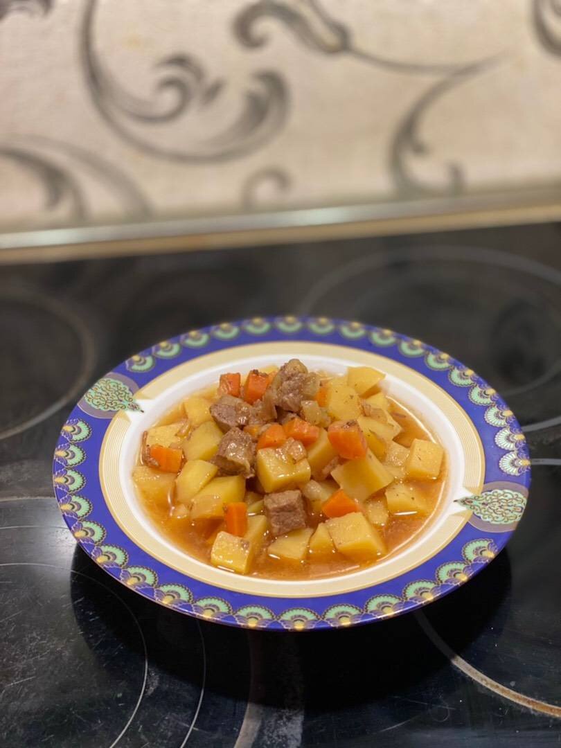 Рецепт на один горшочек Ингредиенты: Говядины, Луковица 🧅, Морковки, Растительное масло, Картофель 🥔, Соль, Перец, Лавровый лист Способ приготовления: Говядину 🥩, лук 🧅, морковь 🥕 режем кубиком и обжариваем на растительном масле слегка посолив и поперчив. Выкладываем на дно горшочка. Картофель 🥔 режем кубиком и выкладываем сверху. Солим. Заливаем холодной водой. Добавляем лавровый лист. Закрываем крышкой и в духовку на 2-2,5 часа при 190°С. Готово. Приятного аппетита.