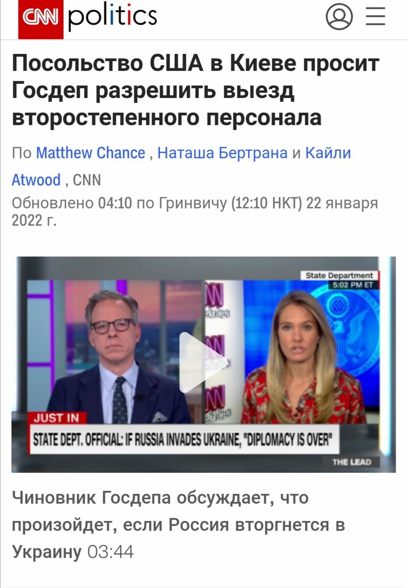 Лицемерие США просто зашкаливает В то время, как штаты и их союзники просто заваливают Украину военными инструкторами и оружием, благословляя ее жителей умирать во благо заокеанского процветания, и заявляют, что не бросят Украину, действия их дипломатов говорят об обратном. Так, в пятницу, в госдепартамент поступило обращение посольства США в Украине, с просьбой разрешить выезд части своих сотрудников с семьями. Информацию об этом опубликовали в CNN. Выходит, что они знают о том, что их военная помощь лишь усугубляет возможное развитие военного конфликта, и не верят в то, что они буду находиться в безопасности. К чему готовятся, когда вводят военных и вывозят дипломатов? А как же жители Украины, их семьи, которые запад своей политикой толкает на братоубийственную войну?