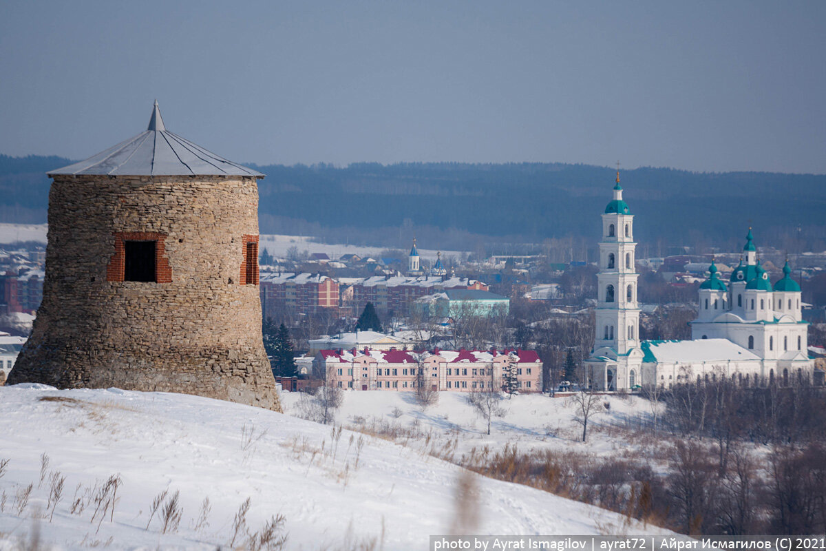 Побывал в Елабуге в третий раз. Не особо долго, но, во-первых, в этот раз посетил музей (будет отдельный рассказ). Во-вторых, это случилось зимой и теперь у меня есть зимние пейзажи Елабуги. Направились к Чертову городищу. Эмир Ибрагим I встречает на привычном месте. Зима не помеха для туристов, на Чертовом городище всегда оживленно. Взгляд на город через зимние Шишкинские пруды. Доминанта городского пейзажа - Спасский собор. Любуется пейзажами и дракон-оракул, герой местных легенд. Изготовил в 2016 году Артур Гатауллин, тоже, кстати, местный. Сквозь морозную дымку угадываются бесчисленные трубы соседнего Нижнекамска. Казалось бы город сугубо промышленный, однако трижды(!) заслуживал звание самого благоустроенного города России. Центр города. Улица Казанская. Зимой можно поймать момент без множества автомобилей в кадре. Места, знакомые по осенней прогулке 2019 года. В плане обилия купеческих особняков Казанская улица интереснейшая, но не единственная. Подозреваю, что и в нетуристически