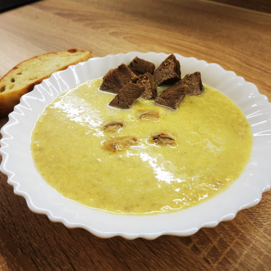 Оригинальный рецепт @cook_27716627 Сайт Cookpad празднует 4 года, поздравляю создателей сайта и всех тех кто пробует, готовит, публикует новые вкусные рецепты😊 #кукпад4 Ингредиенты: Шампиньоны цельные , Картошка , Чеснок, Соль , Перец чёрный молотый , Сыр твёрдый , Лук репчатый, Мясо говядины Способ приготовления: Приготовим наши ингредиенты. Отварим говядину, я нарезала на небольшие кусочки, чтобы быстрее сварить. Добавим немного соли. Нарезаем мелко лук, дольками шампиньоны, картофель, мелко накрошим чеснок. Отваренное мясо выложим отдельно в тарелку и в бульон закинем все наши ингредиенты, лук, чеснок, картофель, грибы, добавим специи. Натрём сыр и разогреем в микроволновой печки. У нас получился плавленый сыр. Наш суп кипит, картофель сварился, можно наложить супчик для пробы не делая пюре, а если хотите пюре, тогда добавляем наш тёртый плавленый сыр, перемешаем блендером. Наш суп готов, получилось вкусно, говядину я нарезала и украсила суп. В каком виде кушать выбирайте сами, но