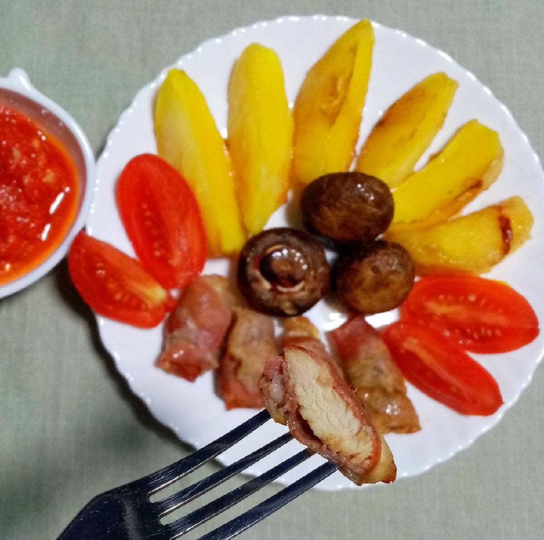 🥓Рулетики из куриного филе в беконе с грибами и картофелем