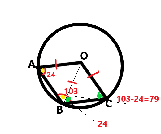 Точка о -центр окружности на которой лежат точки а в и с известно что угол авс 103 и угол оав 24. Найдите угол BCO