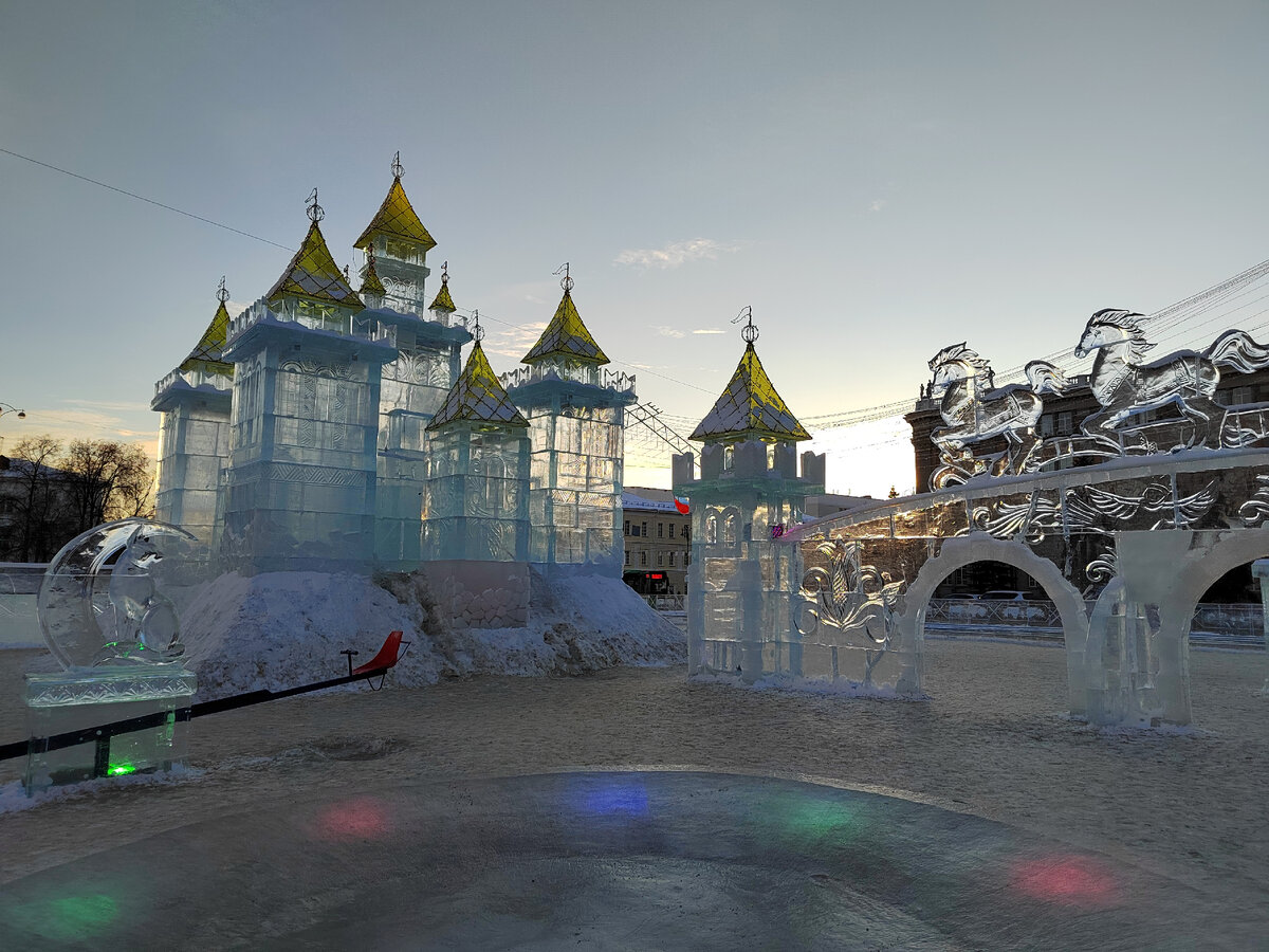 Ледяные замки и крепости. Дети радуются и визжат от восторга. Тысячи тон льда везде. Как такое возможно?! Все очень просто! На центральной площади города вырос #ледяной дворец . Вероятнее всего #снежная королева разбушевалась и построила его себе. Ее даже не смутил дедушка #ленин и Горсовет, которые тут расположены. Зато посмотрите, какие #зимние развлечения для детей ! У меня самого был великий соблазн прокатиться на таких горках. Какая тройка несет сани! А #дед мороз восседает на низ и везет #детские подарки малышам на #новый год ! Вы только посмотрите, какие #ледяные статуи создают мастера! #русская зима сама по себе очень красива и вдохновляет талантливых людей на создание красивого! Мне всегда жаль только одно - придет весна и тысячи тонн люда превратятся в воду. И вся эта красота растает. Это хороший пример того, как все временно в нашем мире! В этом ледяном городке построена #ярмарка , можно купить разные народные продукты и вкусняшки. Взять на прокат ледянку, чтобы покататься