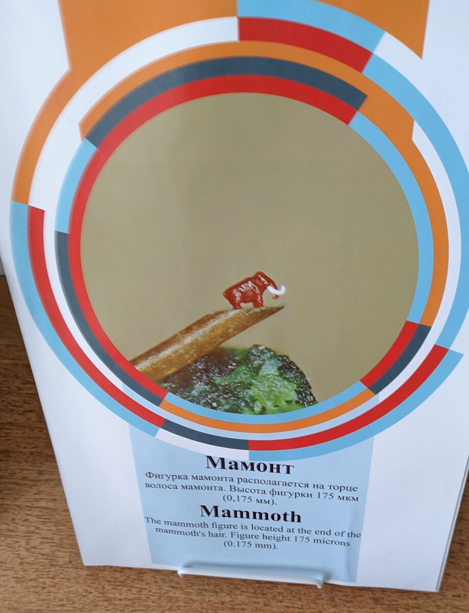 Про Левшу слышали? Который блоху подковал? Так вот, в наши дни в России тоже есть такие умельцы. Нам повезло в Рыбинске попасть на выставку микроминиатюр. Мы побывали в городе, когда там выставлялись работы новосибирского мастера Владимира Анискина из Санкт-Петербургского музея микроминиатюры «Русский Левша». Нам было очень любопытно, так что я советую заглянуть или в музей, или среагировать на фамилию мастера – вдруг в ваш город тоже приедет эта выставка. Заходишь в зал – а там куча микроскопов. Подходишь к ним, а витринах какие-то мелочёвка лежит: волоски, зёрнышки... А потом как глянешь в микроскоп, а потом снова на витрину, а потом снова в микроскоп так и остолбенеешь. Мы увидели, например, фигурку мамонта на волоске, розу в волосе, самую маленькую в мире книгу (ну согласно пояснениям к вывеске), басню Крылова, написанную на рисовом зёрнышке, портрет Гагарина на маковом, и ещё много удивительных штук. Создаётся это всё вручную, под мощным микроскопом. Между ударами сердца – да