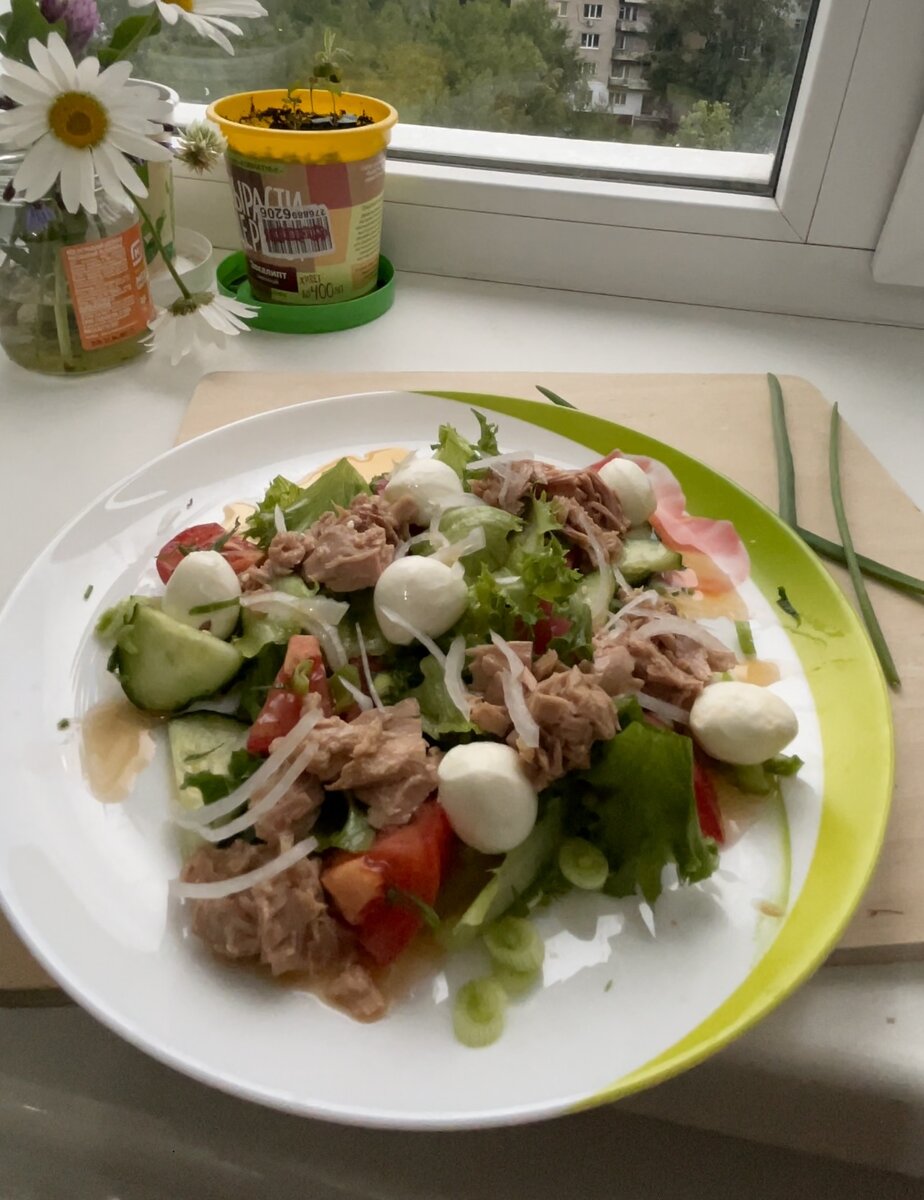 Нежный и очень вкусный салатик. С тостами или хлебцами – просто объедение😋 ⠀ Ингредиенты: 🔸2 огурца 🥒 🔸2 яйца 🥚 🔸1 веточка петрушки и зеленого лука 🔸1 баночка тунца в собственном соку (он кстати по акции в пятерке сейчас😂 не пропустите) 🔸3 ложки сметаны 🔸1 чеснок 🔸Соль, перец по вкусу ⠀ Огурцы и яйца нарезаем кубиками, петрушку с луком так же мелко нарезаем, сливаем воду из баночки с тунцом, разминаем его и добавляем к остальным продуктам, выдавливаем туда чесночок и заправляем сметаной. Солим, перчим. Приятного аппетита 😋 ⠀#салаты рецепты#торт#тунец#суп#готовка#вкусно#быстро#кул