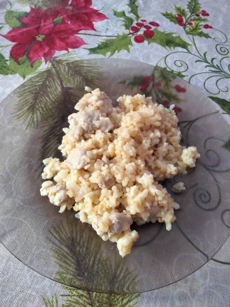 #канікули Ингредиенты: цибуля, свинини, булгуру, олії, сіль, копчена паприка Способ приготовления: Цибулю нарізати кубиками, підсмажити на олії до золотистого кольору. М'ясо нарізати кубиками, обсмажити. Додати 300 мл води, довести до кипіння. Додати сіль, спеції. Додати 150 г булгуру. Варити до готовності приблизно 20 хв.