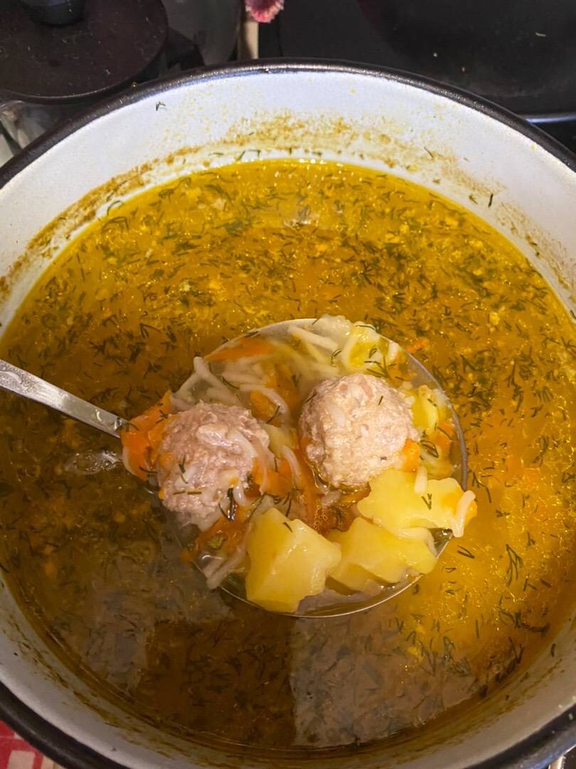 Ингредиенты: фарша домашнего, морковь, чеснока, небольшие картофелины, вермишели, соль, перец, яйцо, Бульон, луковица, морковь, смесь для бульона либо мясо Способ приготовления: Почистить лук и морковь, бросить в бульон. Когда морковь и лук сварятся и станут мягкие, измельчить лук блендером (для тех кто не любит кусочки лука в супе). Морковь можно выкинуть, она не пригодится (можно съесть😋👌). Нарезать картофель кубиками (я резала рифлёным ножом). Добавить в бульон. Сделать зажарку. Морковь, чеснок и перетертый блендером лук пожарить и добавить в бульон. В фарш добавить специи, яйцо и перемешать. Сформировать фрикадельки, добавить в кастрюлю. Добавить вермишель. Варить ещё минут 20. Все готово! Приятного аппетита!😋