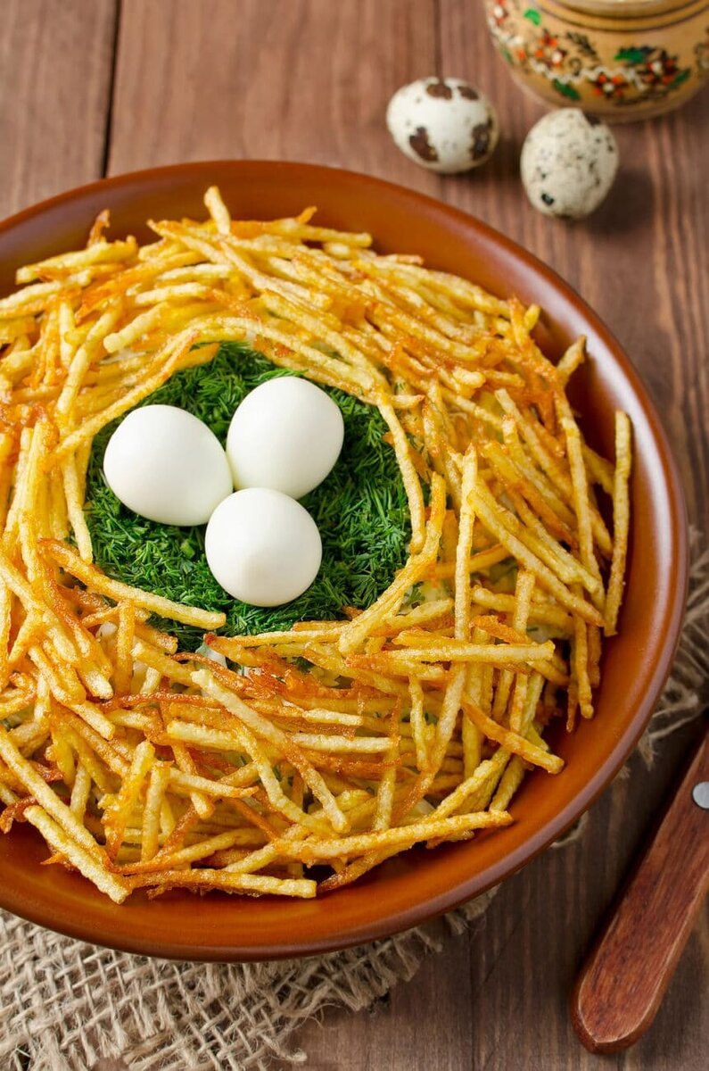5) Все ингредиенты смешать с добавлением майонеза и чеснока для аромата, разложить на тарелочке в форме гнезда, в середину положить шарики из желтков, по краю для кра