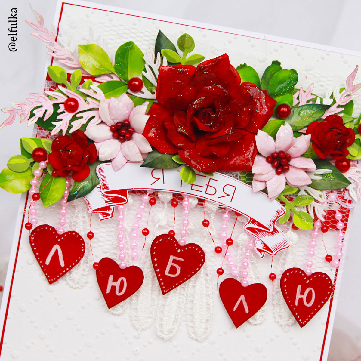 Всем творческий привет! Приглашаю всех заинтересованных понаблюдать за процессом создания сердечной открытки к Дню Влюбленных. Размер открытки 17 Х 13 см МАТЕРИАЛЫ, которые помогали мне создавать эту сердечную открытку: 💗1. Для основы: дизайнерский картон (200гр\м2); 💗 2. Декоративная подложка кардсток с тиснением + цветной кардсток с кусочками фатина; 💗3. Цветы ручной работы (цветики бумажные). Все цветы я делаю сама (они не покупные); 💗4. Различные вырубные веточки и листики + высечки листьев (картинки из интернета); 💗5. Надпись (делала в фотошопе); 💗 6. Сердечки из пивного картона (окрашивала краской, буквы рисовала белой гелиевой ручкой); 💗7. Кружева (висюльки); 💗8. Жемчужные нити (имитация) и половинки бусин; 💗9. Стеклянные капли с глитером от Фабрики (для акцентов); 💗10. Бинтик (марля) для объема цветочной композиции; 💗11. Клей: титан, момент гель (прозрачный). Весь процесс вы можете посмотреть в этом видео. Приятного просмотра 😉💗 Спасибо всем за внимание! Ром