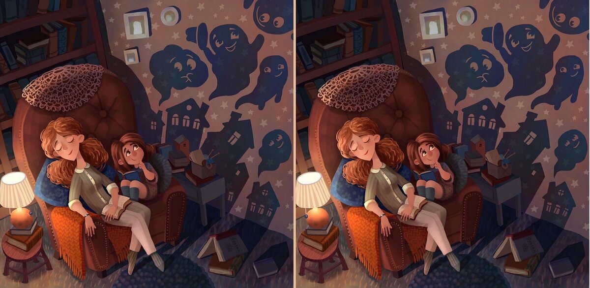 Добрый день, дорогие мои читатели. Детские книги - это странное изобретение человечества. Иногда из них вырастают радужные мечты, а иногда могут появиться и тени на стене. Хорошо, когда мама дома, тогда можно хорошенько рассмотреть этих монстров. Ведь, рядом с мамой ничего не страшно. Не так ли? Пока Вы раздумываете над моим вопросом, разгадайте #головоломку на поиск отличий. Не забудьте заметить, сколько времени у Вас на это ушло. Постарайтесь уложиться в 40 секунд. Это вполне реальная #задача , потому что #задание сегодня несложное. Рассмотрите внимательно картинки и #найдите 5 отличий между ними. Желаю Вам удачи!