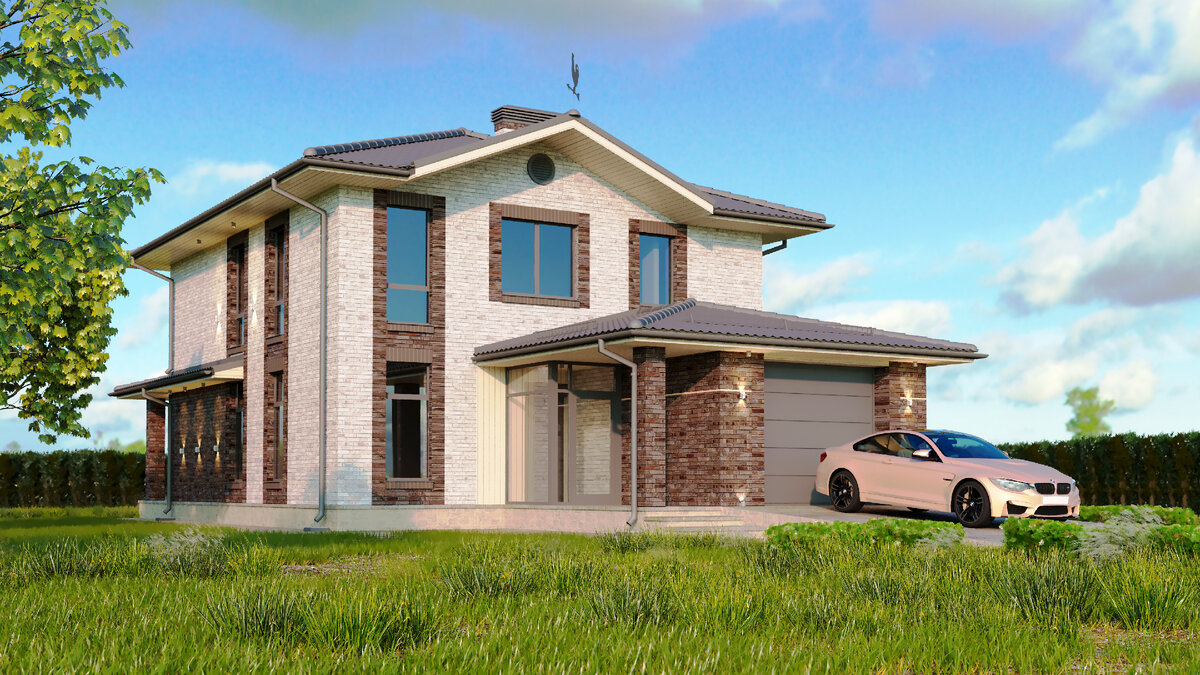 Внешне дом обыгран из комбинации 2-х цветов облицовочного кирпича.