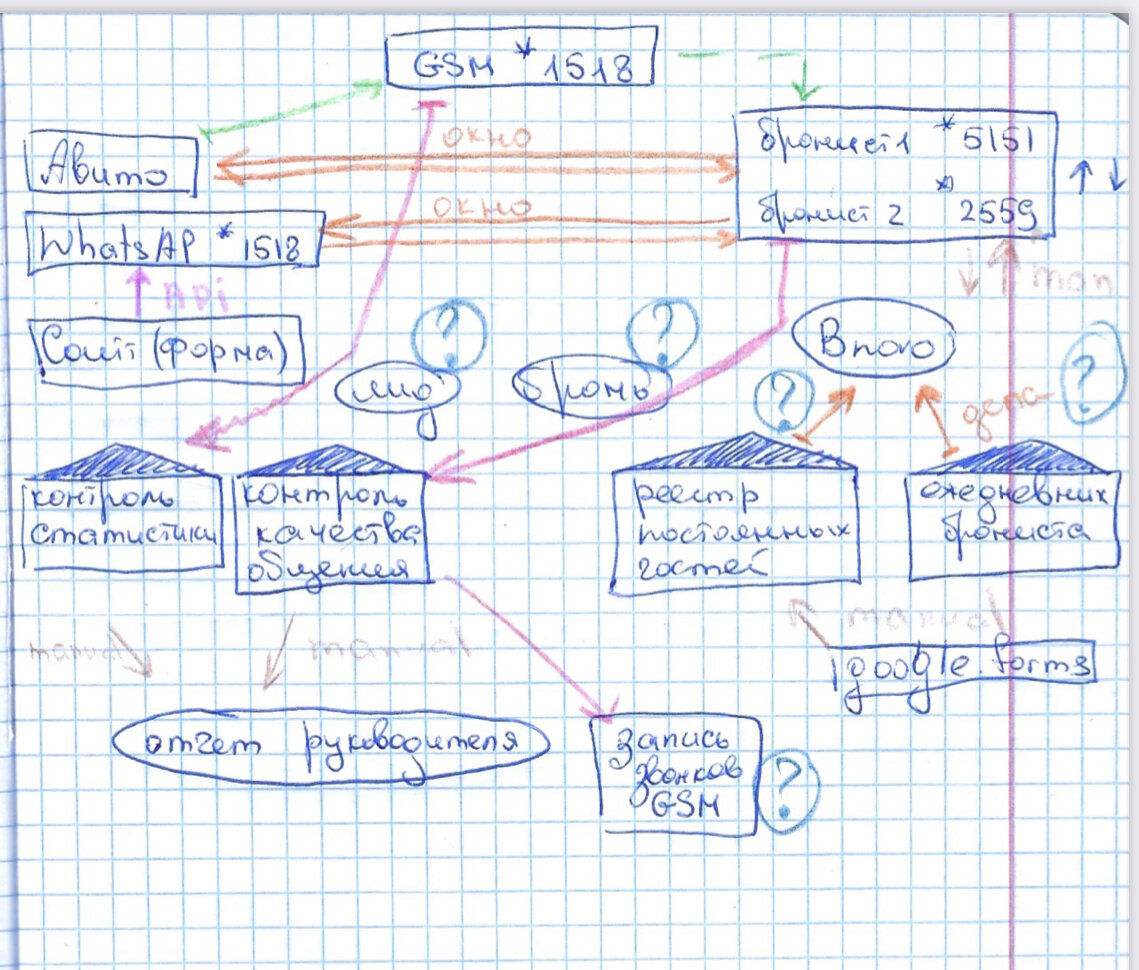 Первый этап задачи в предыдущей публикации. Пробуем выполнить задачу напрямую. Убираем из системы IP телефонию, CRM систему и Rate Shopper. 💫 Самая простая задача с Rate Shopper. Эта программа не связана с процессом общения с гостями и является вспомогательной для revenue manager. Безусловно, она весьма полезна для принятия быстрых решений о корректировке цен, но верхнеуровневый срез по ценам конкурентов реально сделать и вручную. 🔥Как в небольшом отеле проводить анализ цен конкурентов читай в следующих постах. 💫 Дальше - сложнее. Пытаемся убрать из системы IP телефонию и CRM систему. Если не IP, то GSM. Это логично. Два менеджера по бронированию и заселению коммуницируют через обычные SIM карты. На них систему и завяжем. Важно сохранить один номер связи для гостей, чтобы не было путаницы. Для этого берём номер, который используется для общего WhatsApp и пилим на него переадресацию на номера сотрудников. В целом система не пострадала, за одним исключением. 🛑 При исходящих з