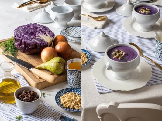 Хотя это блюдо очень часто встречается в рождественских меню, ничто не мешает нам включить этот крем из красной капусты в наши праздники в любое другое время года. Это элегантная, привлекающая внимание закуска, которая имеет все шансы завоевать желудки наших посетителей. Потому что это де-ли-сознание. Кроме того, он очень экономичен, его ингредиенты доступны на всех рынках и в супермаркетах, а приготовление занимает ноль целых ноль десятых. В традиционной кастрюле нам пришлось бы варить его минимум полчаса, и нам нужно было бы добавить больше воды. Но при приготовлении на скороварке нам требуется гораздо меньше времени, меньше воды и меньше масла. Радость, особенно если мы ограничены во времени. Ингредиенты 1/2 красной капусты 2 луковицы 1 груша 500 мл домашнего овощного бульона 200 мл молока или сливок 3-4 столовые ложки оливкового масла экстра вирджин Соль Кишмиш Кедровые орехи Укроп Кухонный нож Pallarès, фарфоровые тарелки Laura Ashley, фарфоровые супницы Revol и неравномерные таре