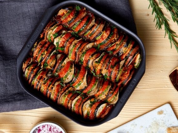 Возьмите мандолину и богатые, красочные и разнообразные свежие овощи: вот секрет, как сделать этот овощной тиан с чесночно-томатным соусом таким вкусным, как вы видите. Это и противень Le Creuset, новый, легкий, прочный и потрясающий для всех видов жаркого. Жарка - это именно то, что мы сделаем с этими нарезанными овощами, стратегически размещенными на противне: сначала мы приготовим домашний томатный соус, разбавленный и насыщенный по вкусу, который станет основой рецепта. Сверху разложим овощи и для придания блюду округлой формы посыплем его сыром. Овощной тиан, несомненно, является классикой французской кухни, и тот, который мы представляем здесь, - это очень натуральный и насыщенный рецепт тиана, со всем вкусом благодаря домашнему ароматному томатному соусу, рецепт которого вы увидите здесь и который посыплет каждый кусочек насыщенным удовольствием. Надеюсь, вам понравится. Противень для запекания Le Creuset Ингредиенты (на 4-6 персон) 1 красный лук, мелко нарезанный кубиками 1 ст