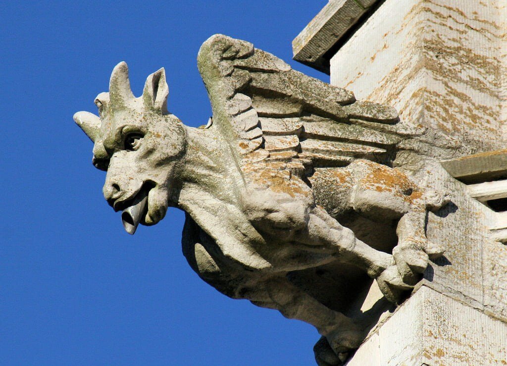 Эти странные, жутковатые, а иногда и просто отвратительные существа, веками нависали над многими улицами старинных европейских городов, безмолвно наблюдая за суетой копошащихся внизу людей... Вырезанная из камня гротескная фигура гаргульи, создавалась для отвода воды с крыш и боковых фасадов крупных соборов и храмов. Дождевая вода стекала по желобу, устроенному в верхней части туловища гаргульи и затем попадала в голову. А уже через глотку гаргульи, потоки дождевой воды отводились от стен храмов. Вода падала на расстоянии от стен, поэтому стены не разрушались, а фундаменты не подмывались. Одной из самых "знаменитых" гаргулий, является гаргулия Фрайбургского собора, которая держится руками и ногами за стену, а вода выливается у нее через задний проход... Легенда гласит, что во время строительства этого собора городской совет беспардонно добавил объем работ каменщикам, без увеличения оплаты их труда. Каменщики работу в итоге выполнили, но в отместку чиновникам разместили эту "переверну