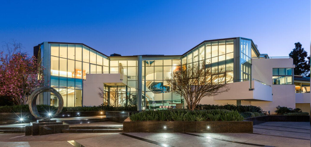 Это потрясающее поместье расположено на вершине голливудских холмов, между Беверли Глен и Бенедикт Каньон, на длинной улице Малхолланд Драйв, которая тянется почти на 80 км. с севера Голливуда до побережья Малибу. Улица петляет по горам Санта-Моника, открывая с расположенных на ней вилл потрясающие виды на город, долину Сан-Фернандо и самые дорогие дома Лос-Анджелеса. Поместье по адресу 14175 Mulholland Drive имеет площадь участка более 16 тыс. кв.м., жилая площадь самого имения составляет внушительные 1 600 кв.м. Особняк раскинулся на живописных зеленых холмах, а ломаные линии его крыши как будто стали частью естественного рельефа этой местности, слившись с ней в одно органичное целое. Фасад дома состоит из сплошных остекленных поверхностей, окна расположены в 4 ряда и ничего не препятствует созерцанию поистине невероятной окружающей панорамы. Ландшафтный дизайн участка поражает своей природной гармонией и красотой, в нем есть каменные скульптуры, пруд с водопадами, горками и гротом.