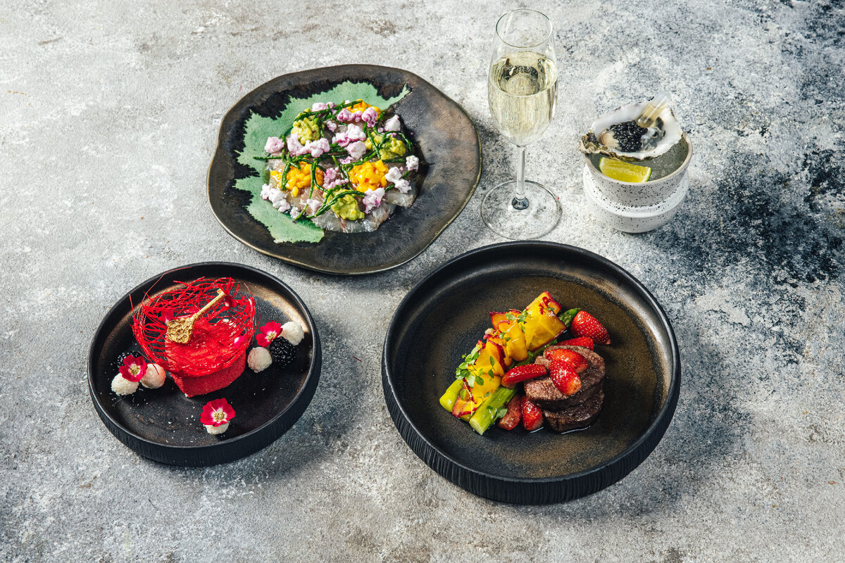 - Сашими: из дальневосточного гребешка с понзу, кимчи и сибулетом; и из средиземноморского сибаса с томатами и юдзу