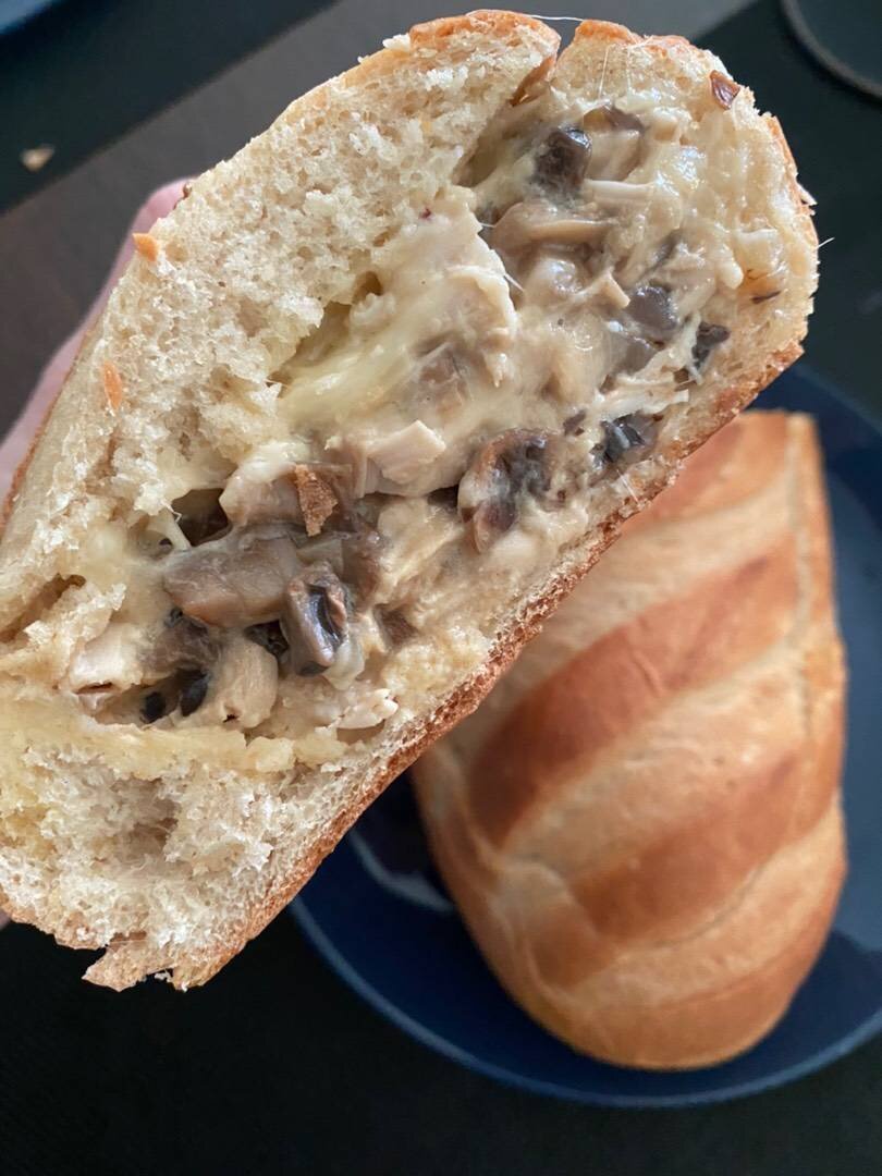 Отличный вариант для завтрака. Ингредиенты: батон, крупных шампиньонов, отварная филе грудки, крупная луковица, тертого твёрдого сыра, Заливка, сметаны, яйцо (С0), муки, Соль Способ приготовления: Разрезаем батон на две части и удаляем мякоть. На слегка смазанной разогретой сковороде обжариваем лук и грибы до золотистого оттенка лука. Режем кубиком курочку. Перемешиваем ингредиенты и отправляем начинку в половинку батона. Готовим заливку. Яйцо, муку, сметану и соль смешиваем. Заливаем наш соус. Посыпаем сверху сыром и накрываем второй частью батона. Отправляем наш батон в разогретую до 300’ духовку на 20 мин.