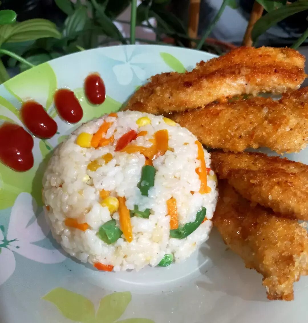 Ингредиенты: Рис отварной , Овощи , Куриное филе Способ приготовления: Овощи подогреть на сковороде добавив 1 ст.л. растительного масла. Как овощи протушаться смешиваем с рисом. Отдельное нарезать полосками филе, перемешать со специями и поджарить. Приятного аппетита