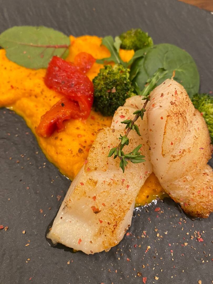 Очень нежное, диетическое блюдо Ингредиенты: Палтус, Морковка, Сливочное масло, Соль и перец, Зира, Зелень, Брокколи, Перец Способ приготовления: Пюре морковное: морковь очистить и отварить. Можно запечь, можно на пару приготовить. А можно отварную немного обжарить на сливочном масле. В блендере измельчить морковку, добавить кусочек сливочного масла. Если хотите более жидкое пюре, можно совсем немного сливок добавить. Я иногда мл 20 добавляю, посолить, добавить измельчённую зиру, совсем чуть-чуть. Пюре готово. Палтус тоже можно обжарить на сливочном масле. У меня маленькие кусочки, поэтому готовы были через 3-5 мин. можно на пару или в духовке приготовить. Посолить и поперчить. Лучше белый или розовый перец. Запечь перец, очистить и замариновать на немного в :оливковое масло, бальзамический уксус, сахар, соль, чеснок и тимьян. Отварить брокколи. Все красиво выложить на тарелку и подавать 👌🏻