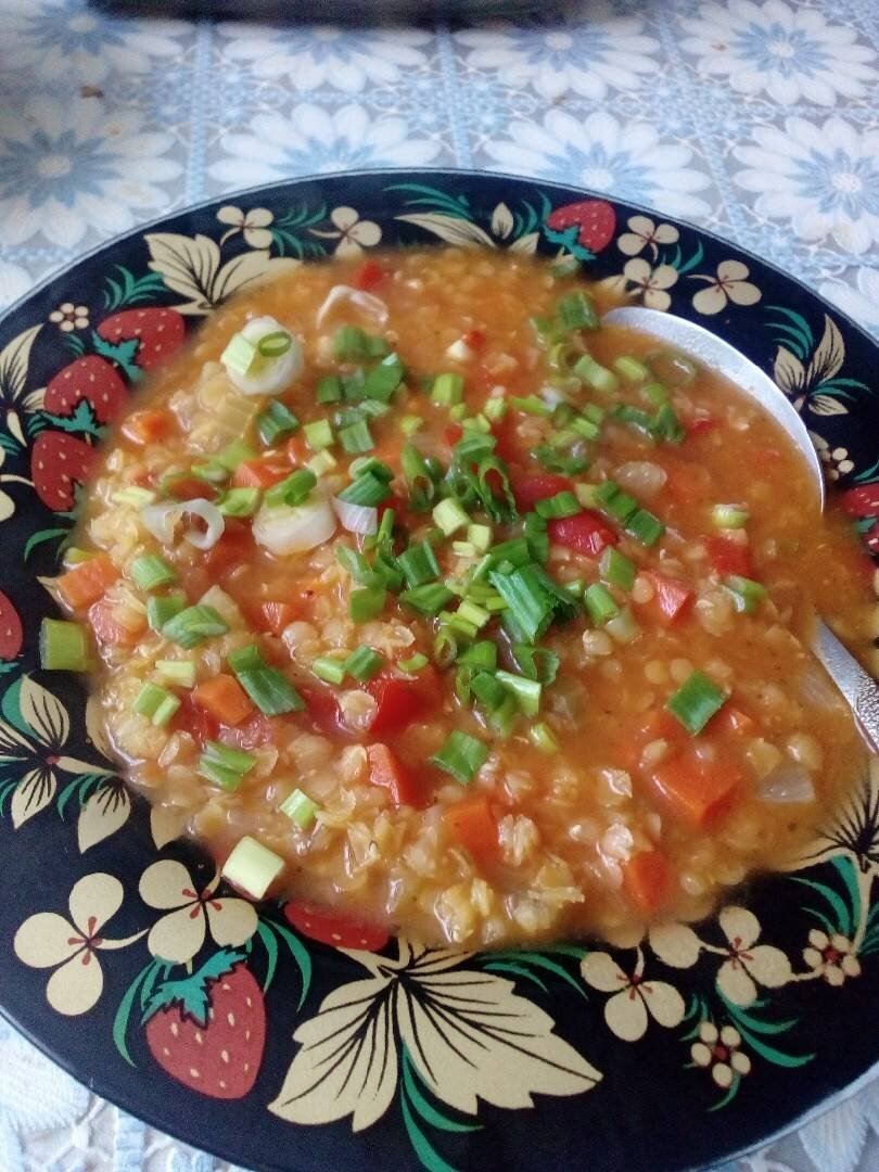 Ингредиенты: красной чечевицы, помидора, болгарского перца, сельдерея, моркови, лука, томатной пасты, Специи, Растительное масло
