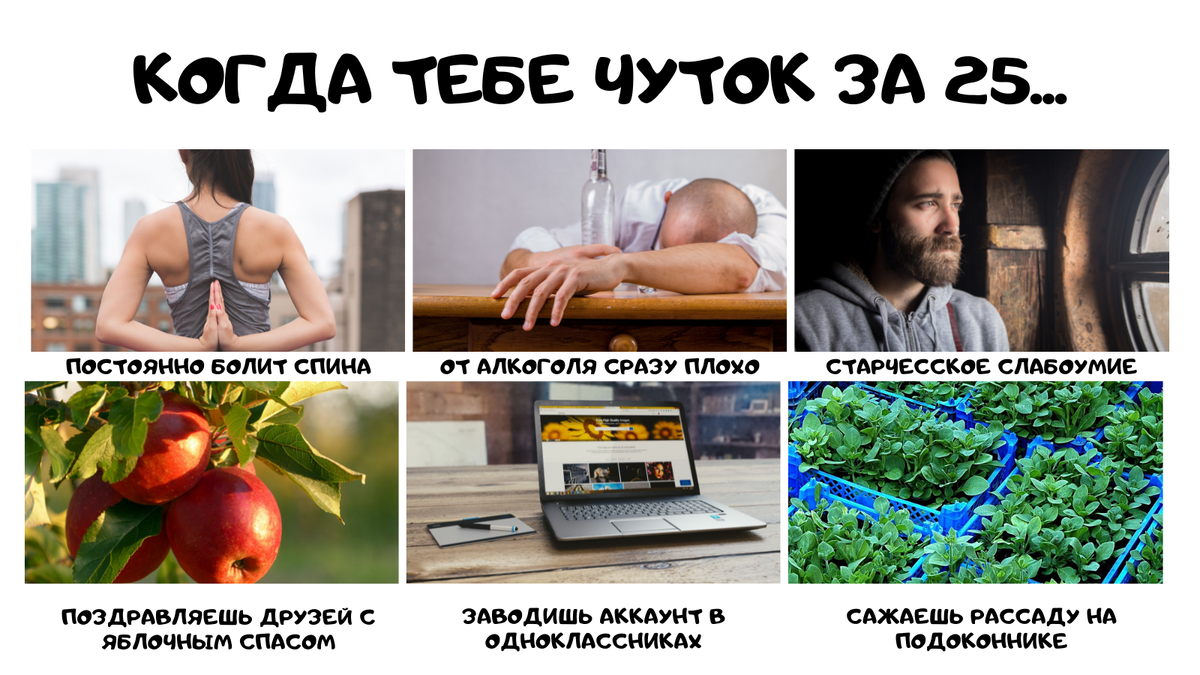 Приветствую вас на канале "О, моя семья!". Вчера я долго думала, о чем сделать новый материал. Долго думать, наверное, вредно! Решила затронуть тему старости, для тех кому чуток за 25. Пишу про себя. Первый раз решила создать мемы, если вам понравится и захотите видеть подобные публикации, поставьте пожалуйста палец вверх!👍 1. Первые признаки старости Это, можно сказать, проверено на своем личном опыте...😂 😃 😄 Только не понимаю, чего плохого в рассаде то, а? 2. Здоровье то уже не то... Голова не та, руки не слушаются, ноги не те... Не то, что раньше. После 25 вообще нужно быть осторожными... Резко ничего не поднимать, ведь спину схватит, резких движений не делать, особенно с дивана. Не надо так! Берегите себя. 3. Пойти на вечеринку или поспать... Выбор очевиден!😂 😃 😄 И кто решил что "поспать" это не важное дело? "Поспать" это святое! "Поспать не предаст", "Поспать всегда нужно!".😂 😃 😄 4. Рассада, рассада, кругом рассада Рассада не только на подоконнике, она везде, она захват