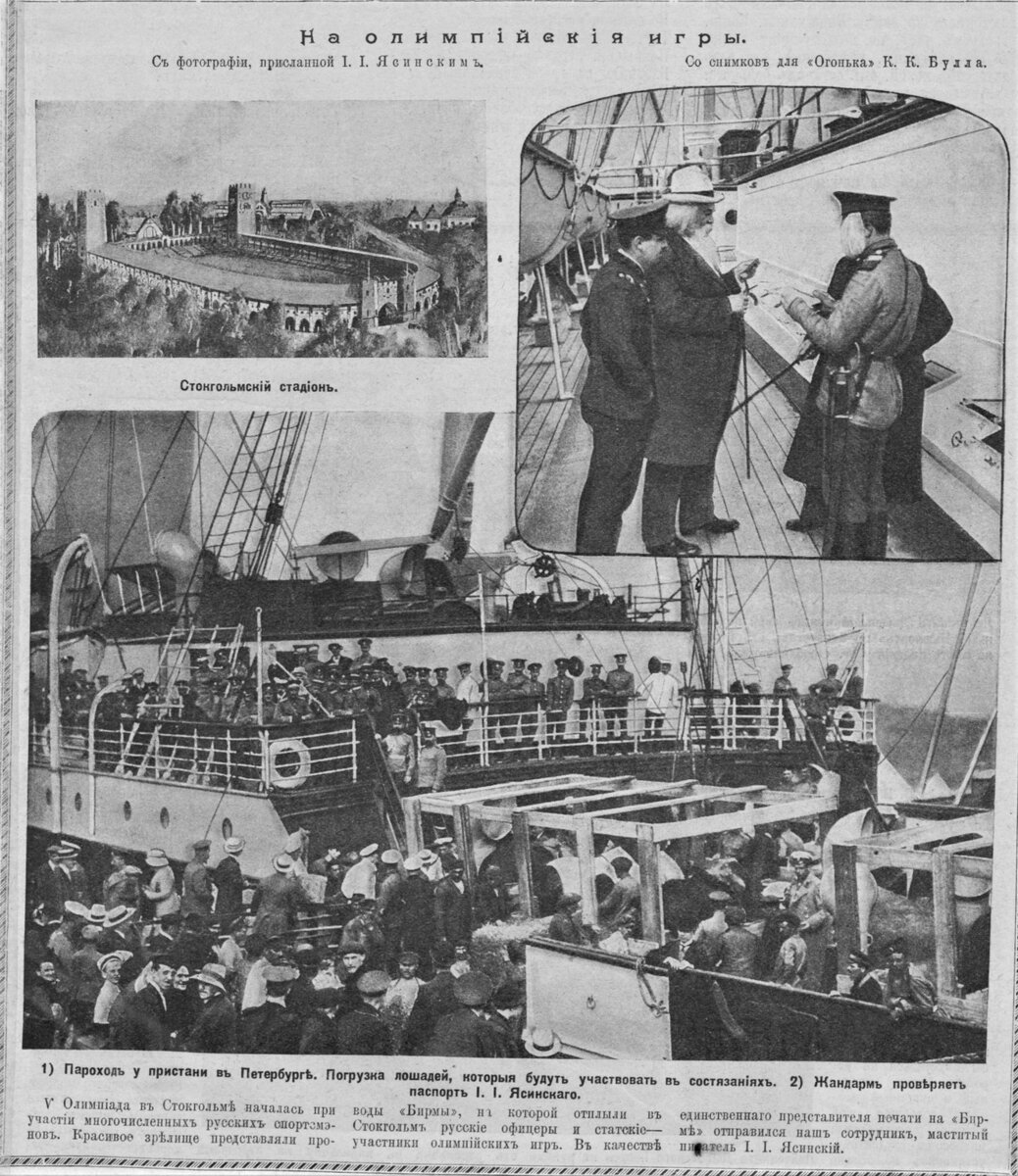 Пишут что Россия отправила “около 200 человек”. Но результат вышел весьма скромным - 2 серебра и 3 бронзы. Финляндия хоть и входила в состав Российской Империи, но выступала отдельно, и получила 4-е место в командном зачете, завоевав 26 медалей, в том числе 9 золотых. В статье об отбытии спортсменов на олимпиаду автор “Синего журнала” был не очень оптимистичен. Но промахнулся с прогнозами. Он был уверен, что за стрельбу медали точно не получим, а у кавалеристов шансы хороши. В итоге 2 из 5 медалей были как раз за стрельбу, а у кавалеристов - ничего. Спортсмены отправились в Стокгольм на корабле “Бирма”, где они похоже и жили, если верить подписи к одному из фото в “Огоньке”.