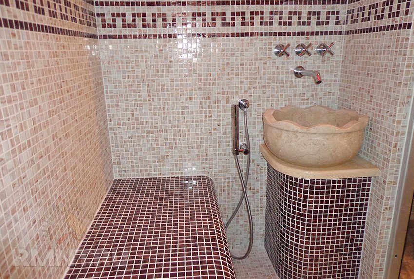 Хамам подключается к системе отопления дома (к основному котлу). Разогрев такой бани «с нуля» будет энергозатратным и может занять до 3-х часов, но помните, что камень в отделке позволит поддерживать температуру «малыми силами» в течение длительного времени.