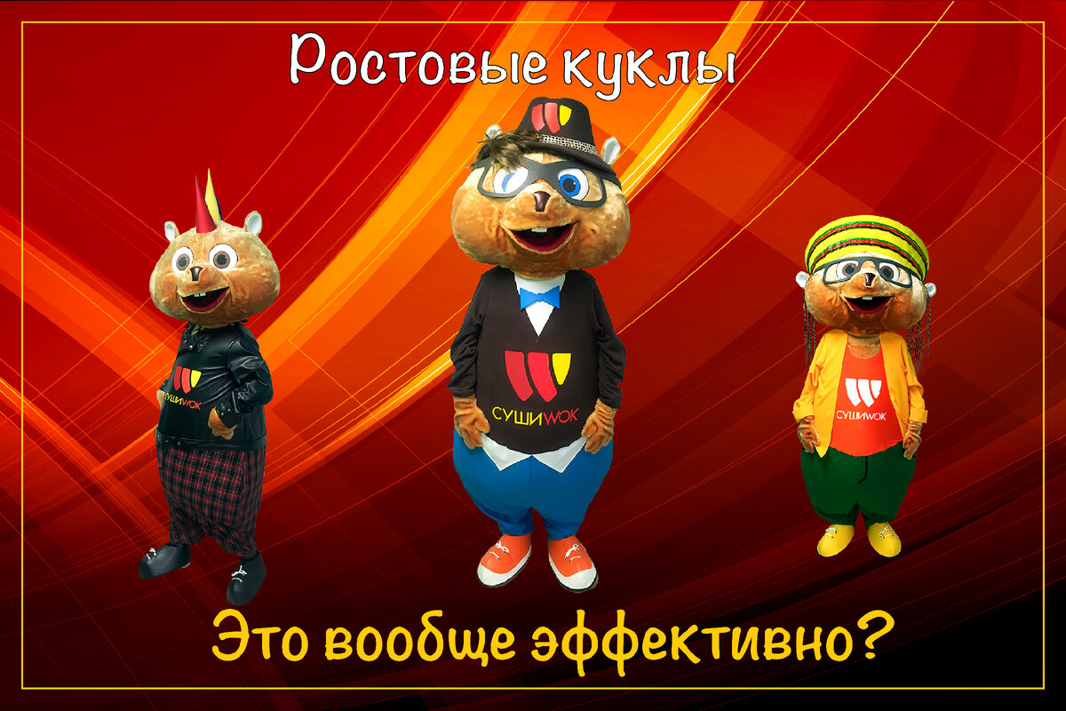 Ростовыми куклами сейчас сложно удивить, но они, по-прежнему, способны вызвать улыбку (и, как следствие, сформировать мгновенную позитивную ассоциацию с брендом). Секрет популярности кукол в том, что и дети, и взрослые воспринимают куклу именно как ожившего персонажа. Костюм скрывает аниматора, находящегося внутри куклы, и позволяет ему полностью перевоплотиться в героя (при этом сотруднику совсем не нужно обладать выдающимися актерскими способностями). Основной задачей куклы становится выстраивание доброжелательной коммуникации. Персонажи должны быть активными и демонстрировать максимальное обаяние и доброту.