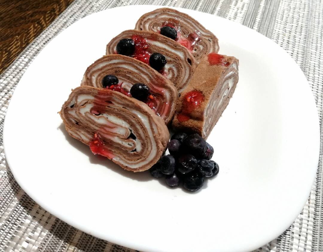 Это безумно вкусное блюдо для любителей сладкого - приверженцев пп, никакого вреда для фигуры и море удовольствия😋. Попробуйте, и вы не пожалеете👍. #десерт Ингредиенты: молока (можно заменить на сыворотку) + 300 мл молока на крем, яйцо + 1 желток (для крема), рисовой муки, кукурузного крахмала + 20 г кукурузного крахмала для крема, соли, сахарозаменитель = 10 г сахара + подсластитель для крема, оливкового масла, какао Способ приготовления: Перемешиваем все ингредиенты, кроме масла, с помощью миксера. Затем добавляем оливковое масло и ещё раз перемешиваем. Сковороду заранее разогреваем и смазываем каплей масла, выливаем тесто на диаметр сковороды и жарим блинчики с двух сторон. Для крема смешиваем 300 мл молока, 20 г кукурузного крахмала, 1 желток и подсластитель по вкусу, ставим все на огонь и помешивая, доводим до загустения. После чего оставляем остывать. После того, как крем остыл, на пищевую плёнку выкладываем 1 блинчик и хорошо смазываем его кремом. Немного отступив от края, нав