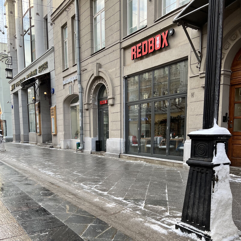 Заведений общественного питания под названием Red Box от Тимура Юнусова и Антона Пинского в Москве появилось сразу два: в Камергерском переулке и на Новом Арбате. Я попал в первое. Фасад обычный: серая стена, красные крупные буквы, и одиночная дверь под аркой лепнины.