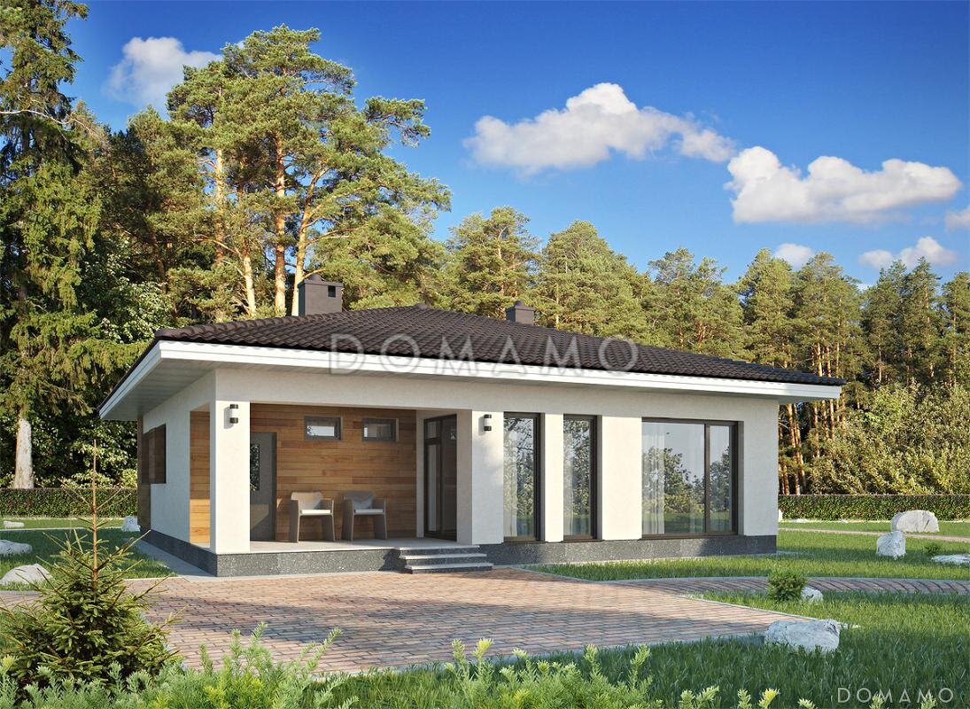 Минималистичный стиль, панорамные окна по всему периметру, небольшая крытая терасса – идеальный вариант для семьи из трех-четырех человек и самый популярный проект 2021 года на портале Domamo.