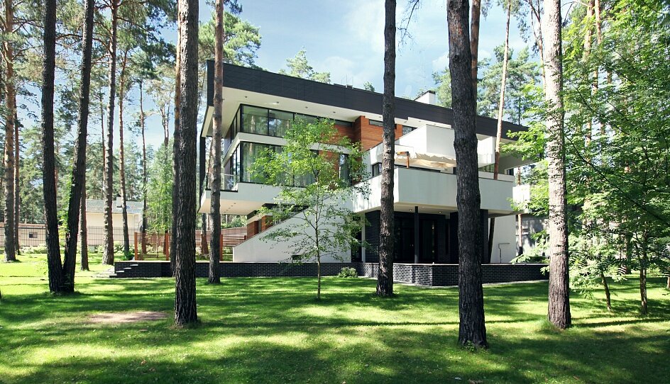 Этот необычный современный дом расположен в КП Николина Гора, который получил свою известность, как стародачное место. Особняк расположен в реликтовом бору. Основной целью проекта было создание компактного коттеджа с четкой геометрией фасада, которая подчеркнута горизонтальными белыми плоскостями, входным блоком и ограждением. Все это вместе создает единый законченный рисунок. Александр Бородавченко, архитектор проекта, гармонично вписал коттедж в окружающий ландшафт. Но при этом дом не сливается с ним, а сохраняет свою индивидуальность. Большая площадь открытых балконов, террас, панорамные окна подчеркивают данную связь. При возведении проекта все старые деревья соснового бора были сохранены. Усадебный комплекс состоит из основного здания, двухэтажного коттеджа для персонала. В комплекс также входит баня с крытой террасой с барбекю. Отделка экстерьера выполнена из высококачественных материалов: металл, стекло, штукатурка, экзотические породы дерева. Помещения здания придерживаются вер