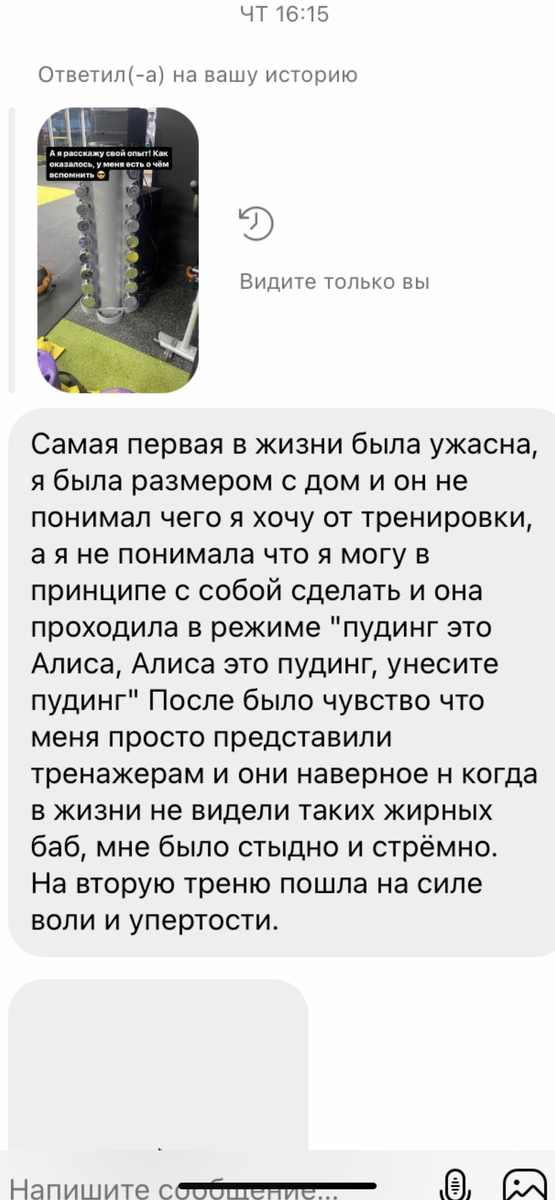 Расскажу предысторию для тех, кто не в курсе. Недавно устроила опрос в инсте по поводу воспоминаний о первой тренировке с персональным тренером и получила сообщение от подруги. Она написала, что первая тренировка была ужасная и объяснила почему. К сожалению, таких историй пришло много. Хочу разобрать эту ситуацию с точки зрения потребителя, то есть клиента персонального тренера. Для этого абстрагируемся. Представьте, вы пришли на макияж и вам говорят: «у вас рот - щёлочка, надо увеличить; большие щёки - замаскировать бы; с ушами даже и не знаю что делать, это же сколько надо волос, чтоб прикрыть всё это!!!!!». Или второй вариант: «подчеркнем цвет глаз, немного затемним под скулами, в центр губ нанесем блеск». Очевидно, что со вторым мастером работать гораздо приятнее, если ваша цель получить результат и не быть униженной. И ещё: один плохой мастер - не повод отказываться от косметики. Теперь вернёмся к тренерам. Вы вправе выбирать не только профессионала, но и человека, с которым будет
