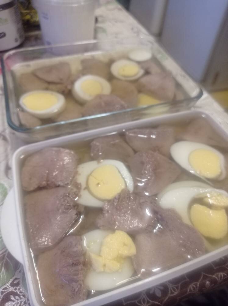 Очень любим языки и обычно съедали их с хреном просто вареные. Заливное тоже очень нравится, и, наконец-то дошли руки его приготовить))). Ингредиенты: Языки свиные, Желатин , Лук репчатый, Яйца вареные, Морковь вареная, Зелень для украшения (петрушка, укроп), Соль, перец Способ приготовления: Языки помыть, залить водой и поставить на огонь. Как только закипит - снять с огня, воду слить. Помыть языки ещё раз, в чистую кастрюлю налить чистой горячей воды (я наливаю из чайника). Положить туда языки и очищенную луковицу. Довести до кипения, потом убавить газ и при минимальном "побулькивании" варить не менее 2 часов. Если первую воду не слить, то бульон получится мутноватый и его придется процеживать. То же произойдет, если бульон будет сильно кипеть. Языки и лук вынуть из кастрюли. Языки обдать холодной водой, лук выкинуть. Налить в кружку примерно 150 мл бульона, когда немного остынет, развести в нем желатин (не в горячем). Снять с языка "шкурку", срезать лишние "ошмётки" и нарезать пласт