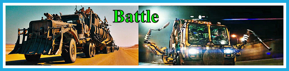 Сравнение носит полу развлекательный характер, поскольку автомобили в реальности, как они представлены в кино, не существуют. Потому на достоверность не претендует. Первая машина-герой - постапокалиптический тягач с прицепами, который пересекает солончак с главными героями. Второй автомобильный герой - личное транспортное средство четырёх братьев черепашек из фильма. Версии: фура из фильма «Безумный Макс. Дорога ярости». Грузовик-мусоровоз из фильма «Ниндзя Черепашки» 2016 года.