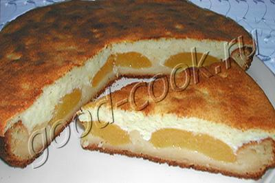 Можно запечь нижний слой отдельно (время запекания сократится), а потом уж выложить персики и залить бисквитным тестом. Только персики придется специально подсушивать.