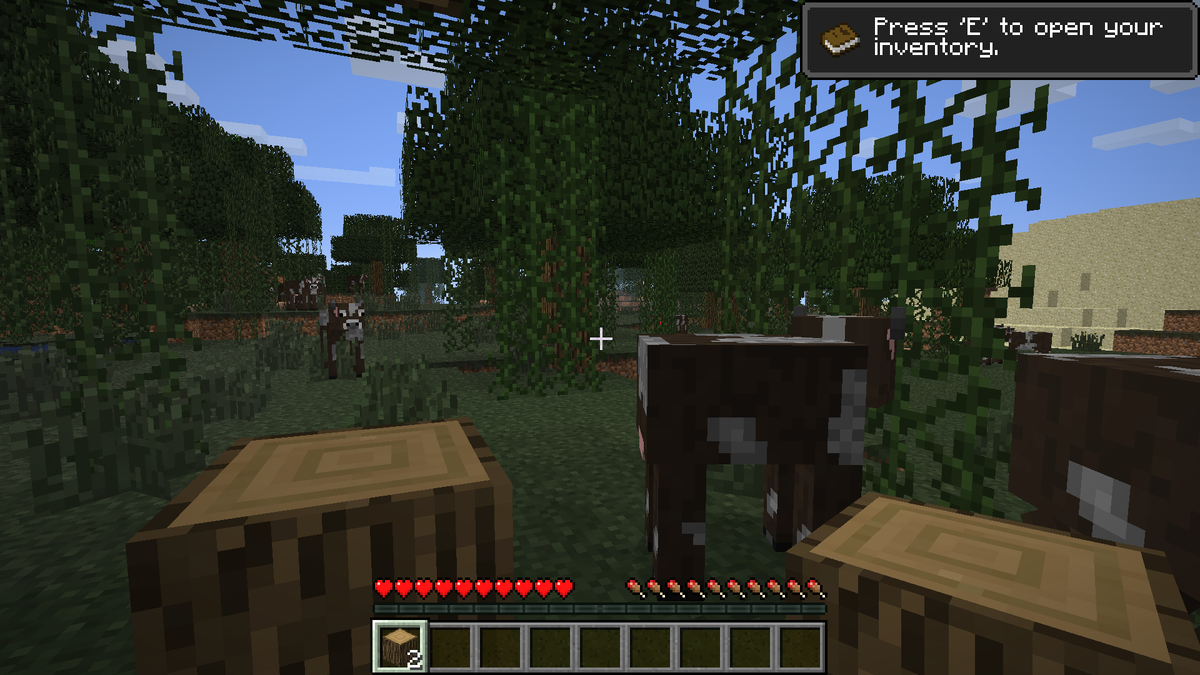 С первого момента игры в новом мире, я заметил большое стадо коров, которое всё время кружило около меня. Это было странно, но всё же можно продолжать играть. Первым делом я как обычный игрок стал разносить дерево в хлам. У меня это естественно вышло. После я решил что доски нам больше пользы дадут, нежили дуб в чистом виде. По этому я стал делать непосредственно их, после верстак.