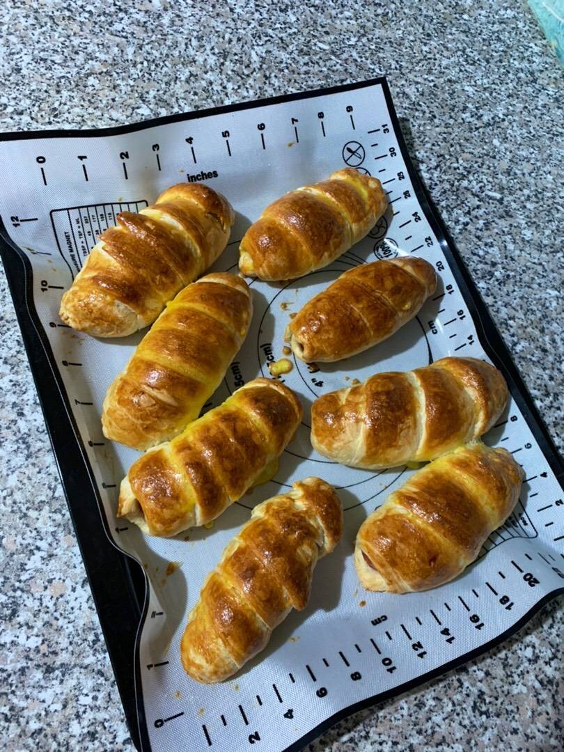 Как очень быстро порадовать домочадцев👍🏼 Ингредиенты: Слоённое дрожжевое тесто, Сосиски молочные, Яйцо Способ приготовления: Нарезать тесто на 8 полосок, каждую раскатать. Завернуть сосиски в полоски из теста внахлест, взбить одно яйцо. Уложить сосиски в тесте на противень (на силиконовый коврик) и смазать яйцом, оставшееся не выливать. Запекать в заранее разогретой духовке 35 минут при температуре 180 градусов, режим верх и низ, за 5 минут до готовности смазать сосиски в тесте оставшимся яйцом. Приятного аппетита 😽