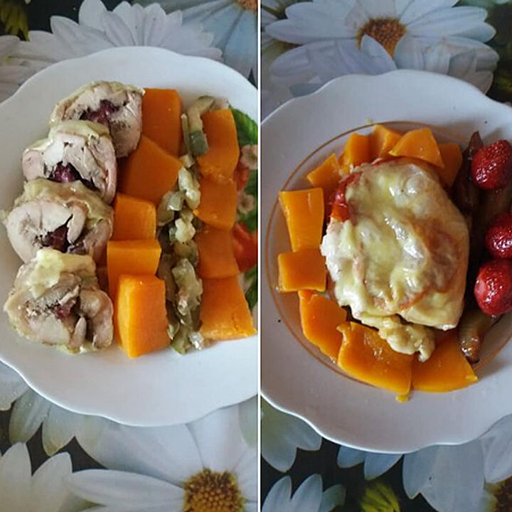 На дно сковородки отправила кабачки мороженые, слегка подсоленные. Сверху на них положила рулетики и грудку. И сбоку разместила кусочки тыквы.