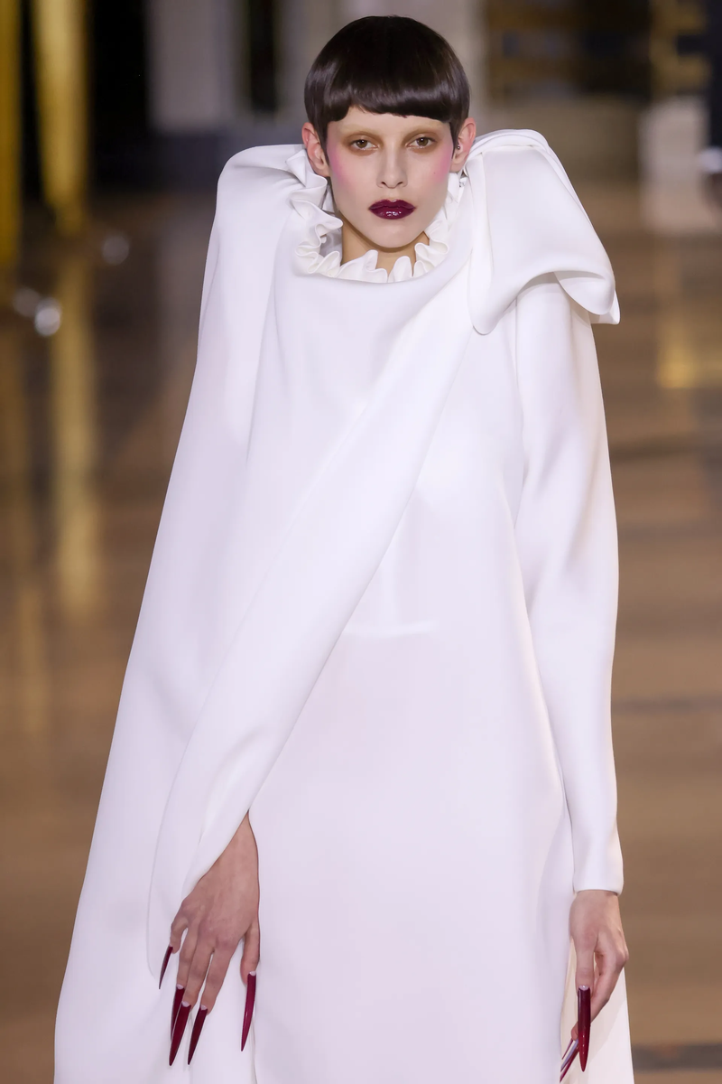Кутюрный показ весна-лето 2022 голландского модного Дома Viktor & Rolf после двухлетнего молчания прошел с поистине королевским размахом. Гипертрофированно поднятая линия плеч, корсеты и длинные наращенные ногти — дизайнеры не скрывали, что при создании коллекции вдохновлялись вампирской эстетикой. И если современное прочтение темы уже давно стало частью поп-культуры нашего времени (привет всем фанатам «Сумерек»), то бренд сделал ставку на архетипичный образ Дракулы. Макияж здесь больше забавный, чем модный — казалось, что вампиры за время заточения совершенно забыли, как выглядят реальные люди и поэтому перед выходом на подиум перестарались с румянами. А вот маникюр нас покорил: супердлинные ногти заостренной формы в двух оттенках (нежно-розовом и насыщенно-бордовом) выглядели вполне убедительно и готически, забирая все внимание на себя. Кажется, экстрадлина в 2022-м заживет новой жизнью. И это наш официальный прогноз. Не так давно экстремальное наращивание в умах публики прочно ассоц